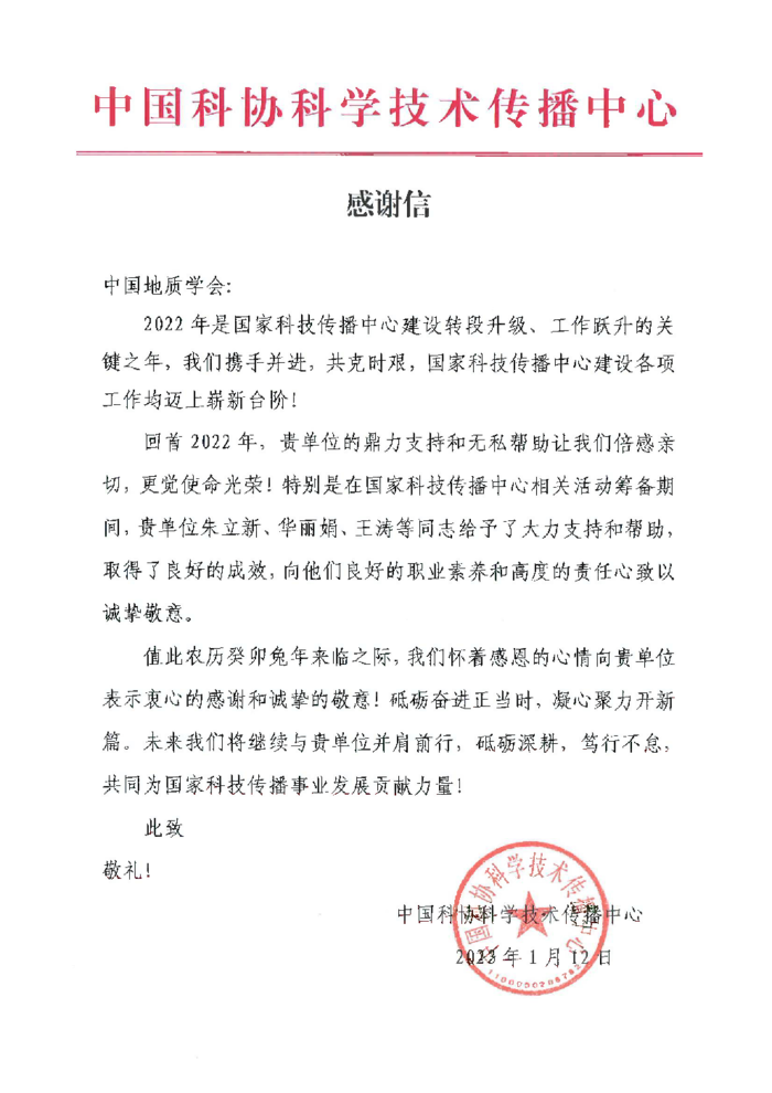 中國科協(xié)科學技術傳播中心向中國地質學會發(fā)來感謝信