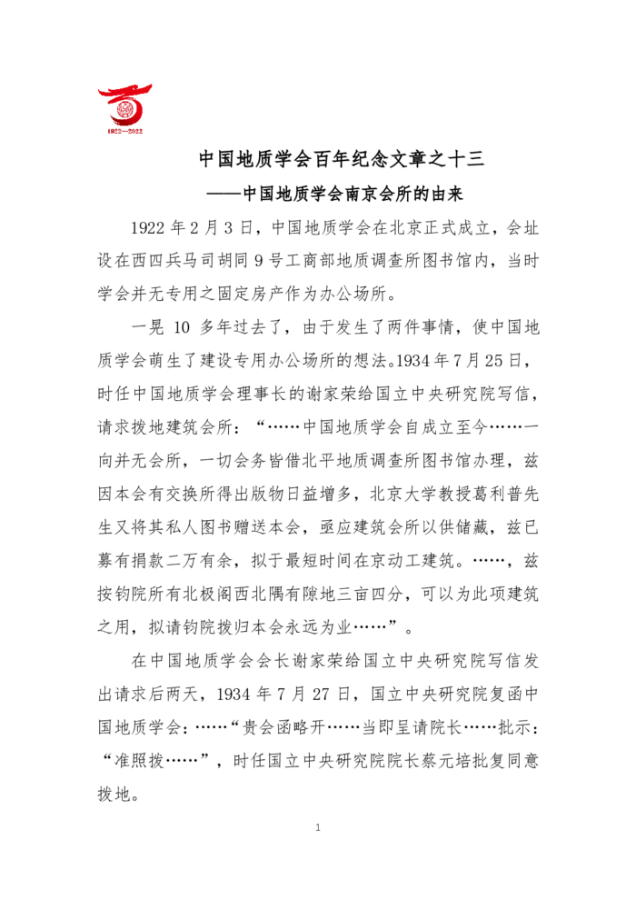 中國地質(zhì)學(xué)會(huì)百年系列紀(jì)念文章之十三——中國地質(zhì)學(xué)會(huì)南京會(huì)所的由來