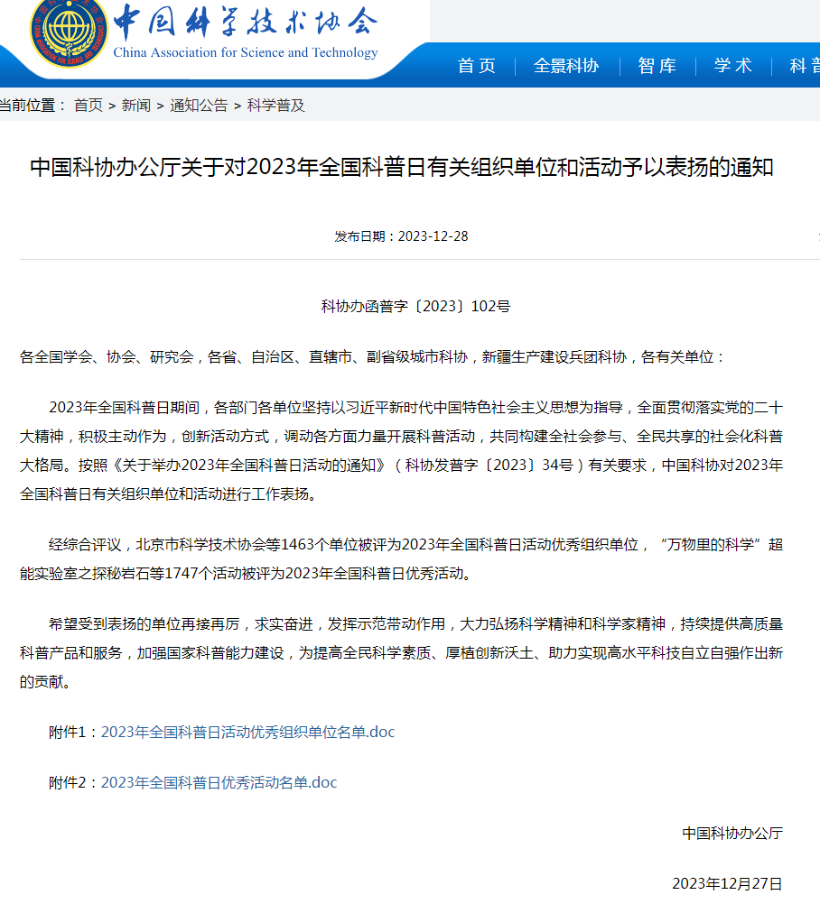 中國(guó)地質(zhì)學(xué)會(huì)榮獲中國(guó)科協(xié)2023年“全國(guó)科普日活動(dòng)優(yōu)秀組織單位”