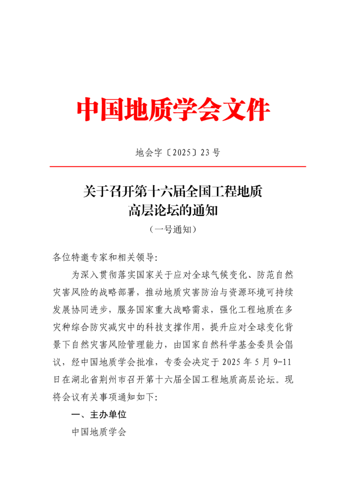 關(guān)于召開第十六屆全國工程地質(zhì)高層論壇的通知(一號通知)