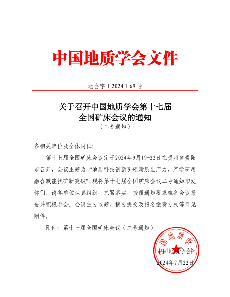關(guān)于召開中國地質(zhì)學(xué)會第十七屆全國礦床會議的通知(二號通知)
