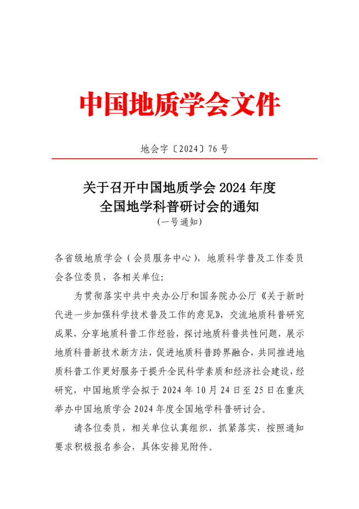 關(guān)于召開中國地質(zhì)學(xué)會2024年度全國地學(xué)科普研討會的通知(一號通知)