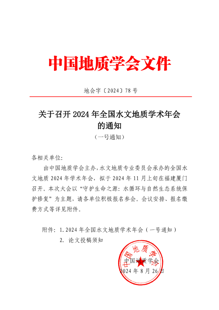 關(guān)于召開2024年全國水文地質(zhì)學(xué)術(shù)年會的通知(一號通知)