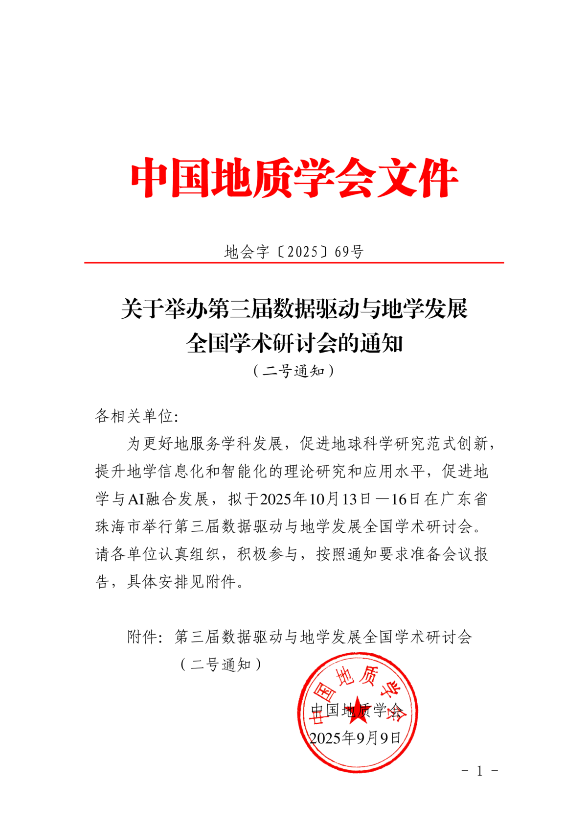 ? 關(guān)于舉辦第三屆數(shù)據(jù)驅(qū)動(dòng)與地學(xué)發(fā)展全國(guó)學(xué)術(shù)研討會(huì)的通知(二號(hào)通知) 2025-09-24