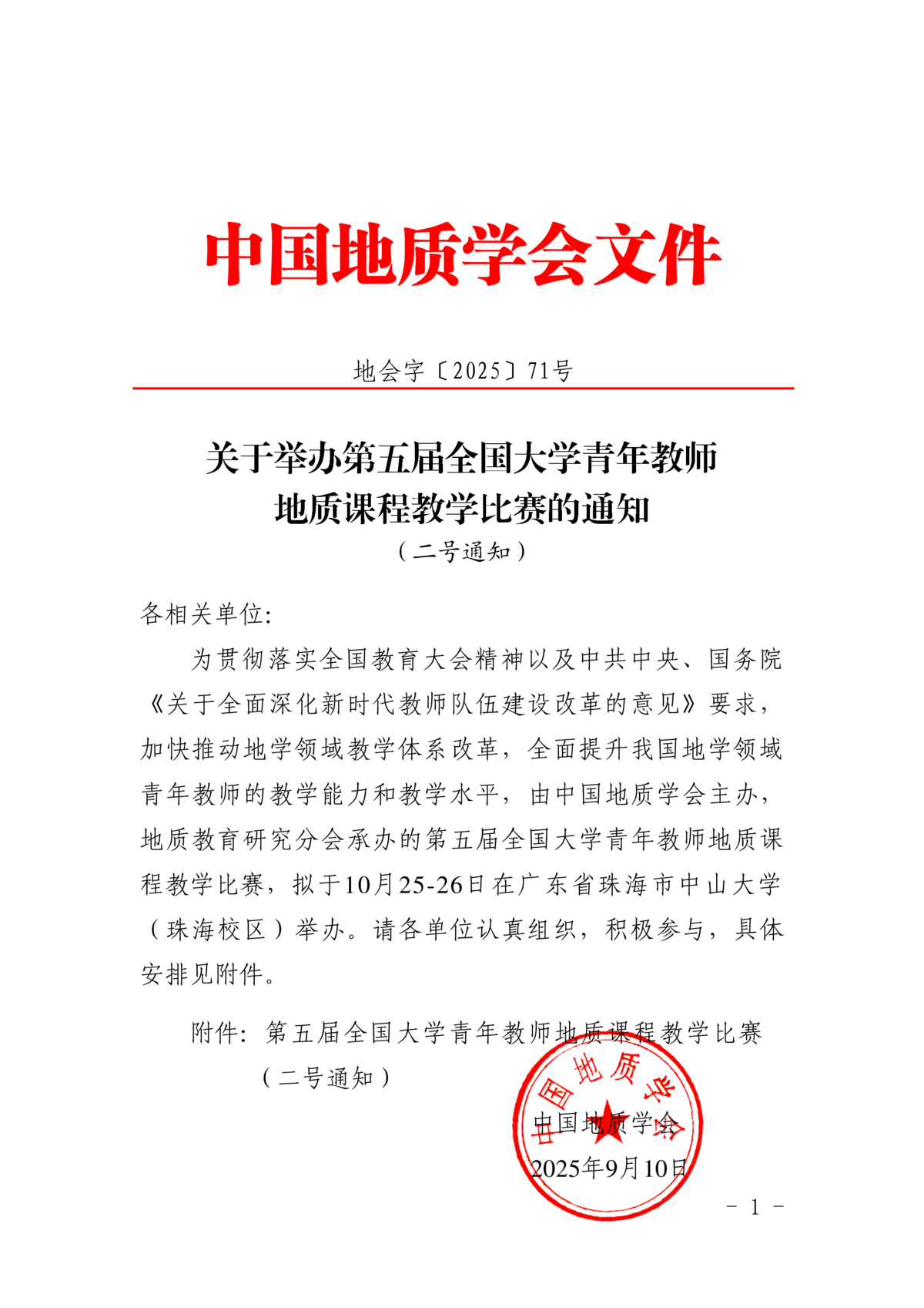 ? 關(guān)于舉辦第五屆全國(guó)大學(xué)青年教師地質(zhì)課程教學(xué)比賽的通知(二號(hào)通知) 2025-10-10