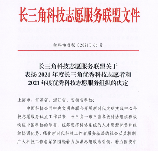 安徽省地質(zhì)學會榮獲“2021年度長三角優(yōu)秀科技志愿服務組織”稱號