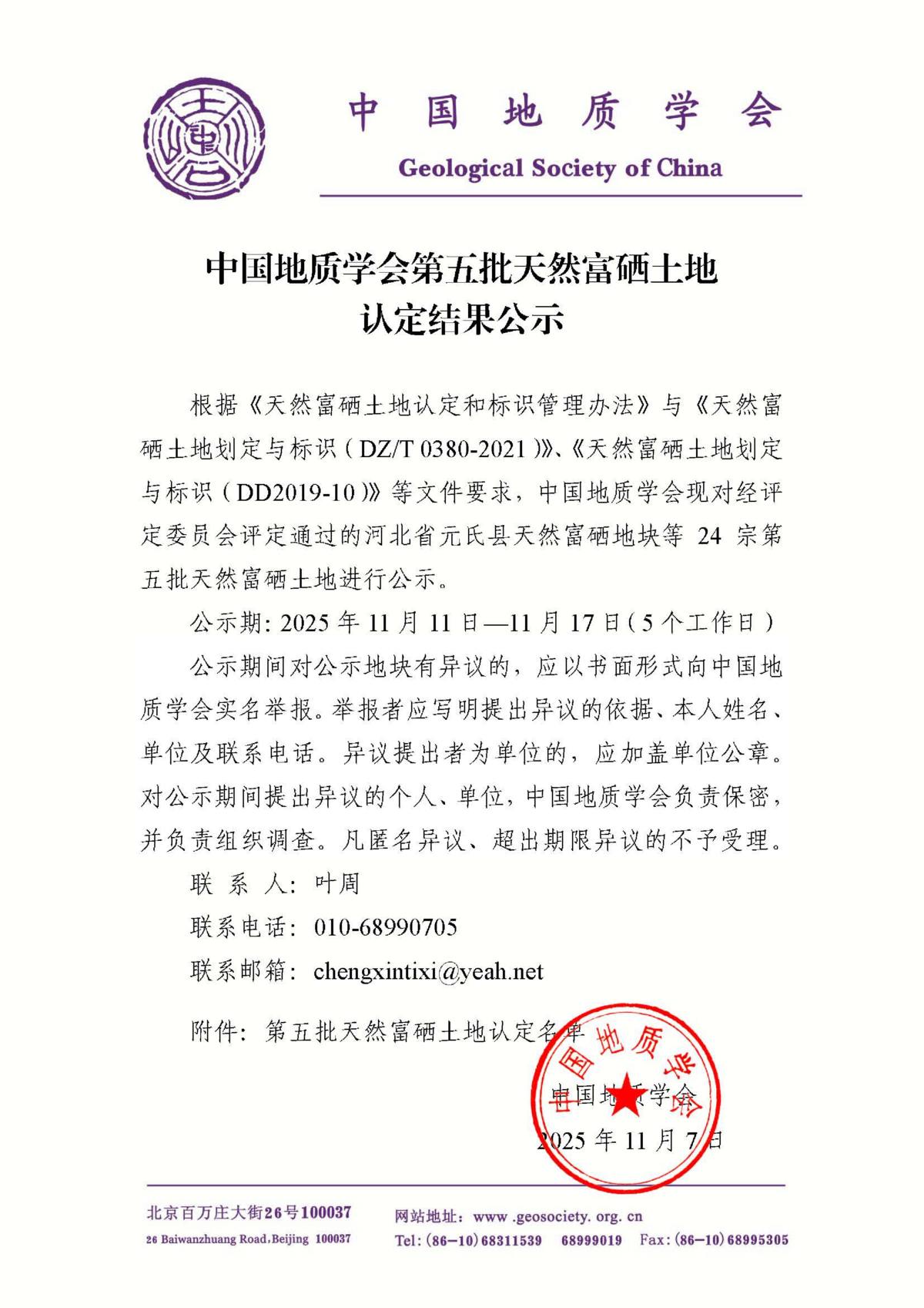 ? 中國地質(zhì)學(xué)會第五批天然富硒土地認(rèn)定結(jié)果公示 2025-11-11