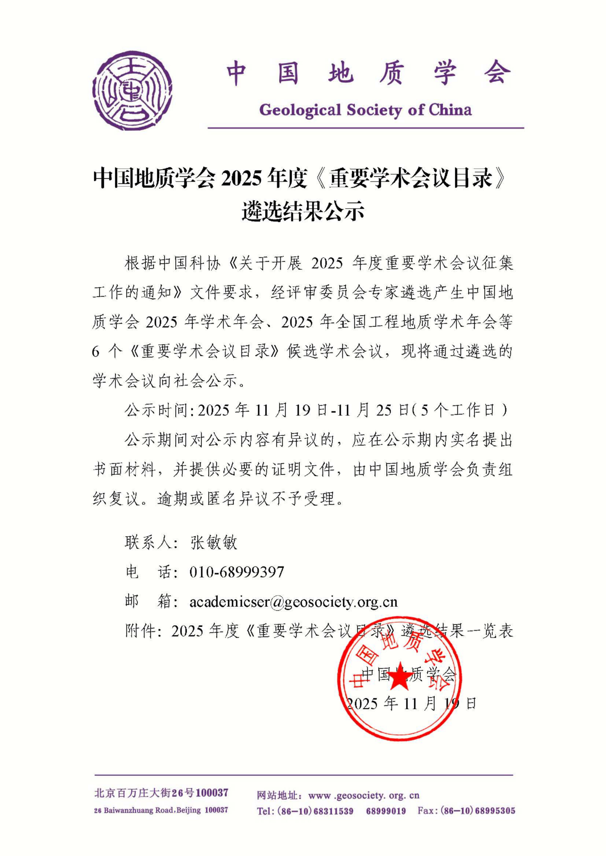 ? 中國地質(zhì)學(xué)會2025年度《重要學(xué)術(shù)會議目錄》遴選結(jié)果公示 2025-11-19