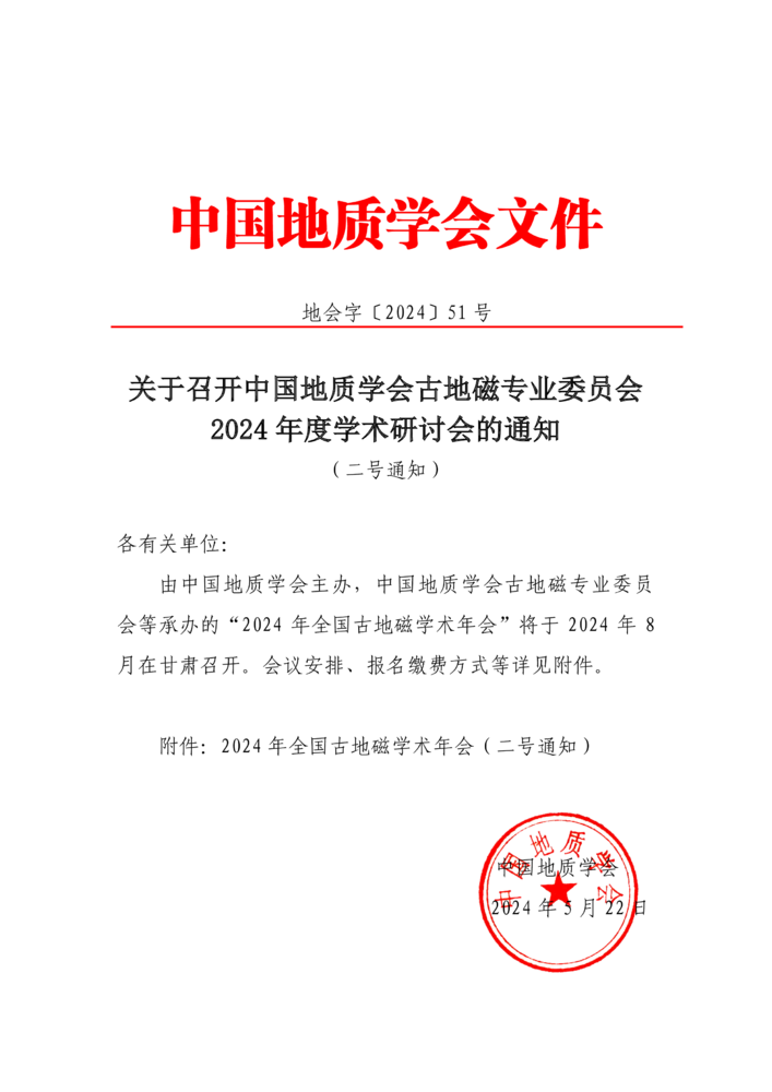 ? 關(guān)于召開中國地質(zhì)學(xué)會(huì)古地磁專業(yè)委員會(huì)2024 年度學(xué)術(shù)研討會(huì)的通知 (二號(hào)通知) 2024-05-28