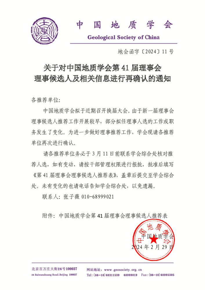 關(guān)于對(duì)中國(guó)地質(zhì)學(xué)會(huì)第41屆理事會(huì)理事候選人及相關(guān)信息進(jìn)行再確認(rèn)的通知