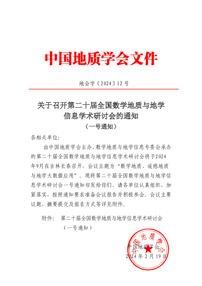 關(guān)于召開第二十屆全國(guó)數(shù)學(xué)地質(zhì)與地學(xué)信息學(xué)術(shù)研討會(huì)的通知(一號(hào)通知)